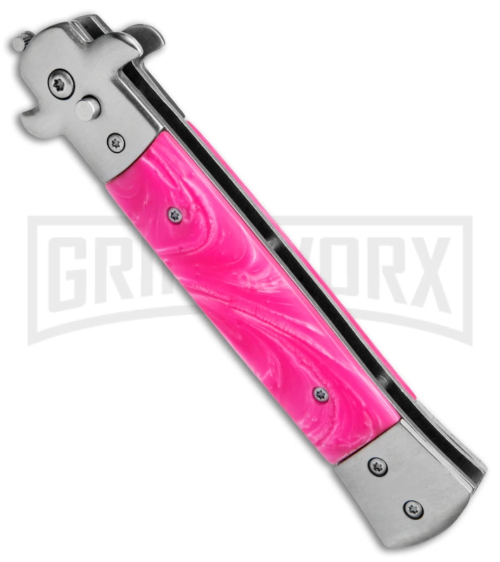 This Milano Stiletto comes in the classic Italian style. It has a razor sharp bayonet blade made from 440 stainless steel. The handle features pink acrylic handle scales and a tip-up carry pocket clip. Add this great looking automatic to your collection today!