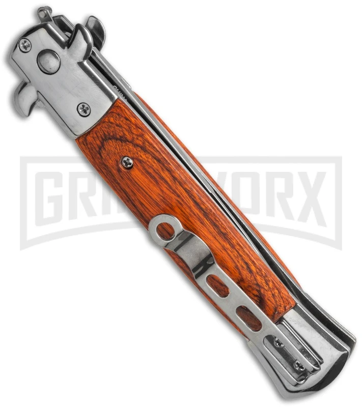 This Milano Stiletto comes in the classic Italian style. It has a razor sharp bayonet blade made from 440 stainless steel. The handle features red wood handle scales and a tip-up carry pocket clip. Add this great looking automatic to your collection today!