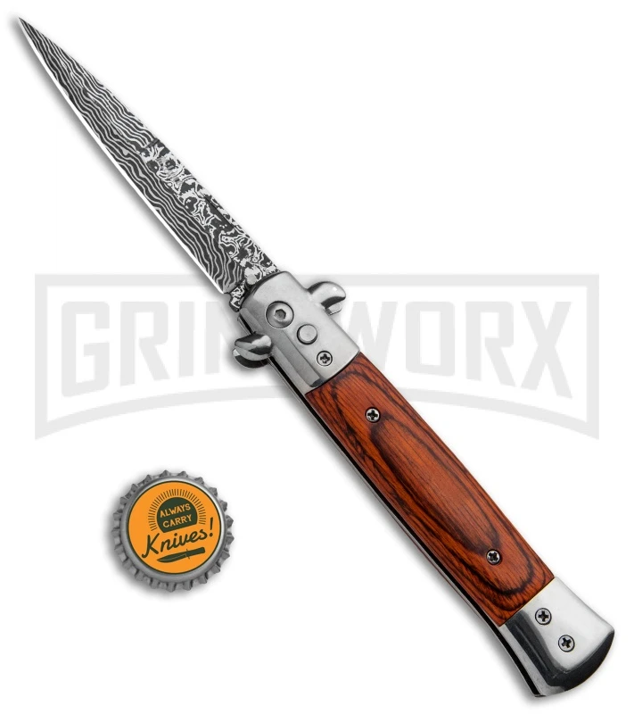 This Milano Stiletto comes in the classic Italian style with a rosewood handle and a damascus patterned blade. The blade comes in a bayonet style made from 440 stainless steel. It’s outfitted with sim horn handle scales and a tip-up carry pocket clip. Add this great looking automatic to your collection today!