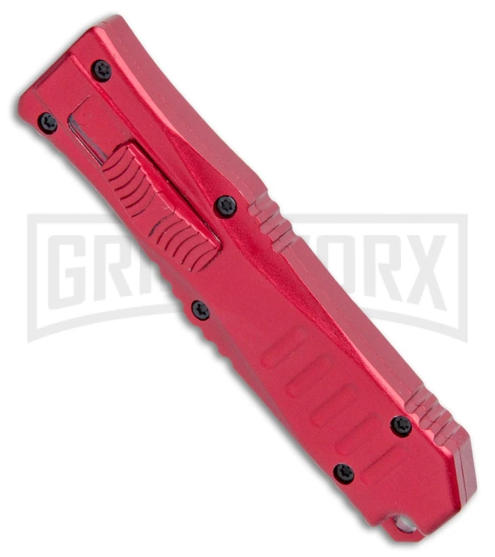 The Mini Marvel offers amazing automatic action considering its compact size. It has a dual action sliding button that smoothly opens and closes the knife with ease. The stainless steel blade comes in a black finish. It has a red aluminum handle with a lanyard hole in the end for attaching to a keychain, backpack, or lanyard. The Mini Marvel offers a compact design and a budget friendly price.