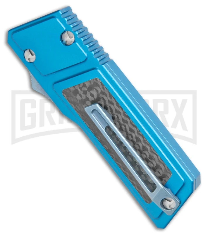This No Limit Akuma has a blue aluminum and carbon fiber handle and satin finished dagger blade.