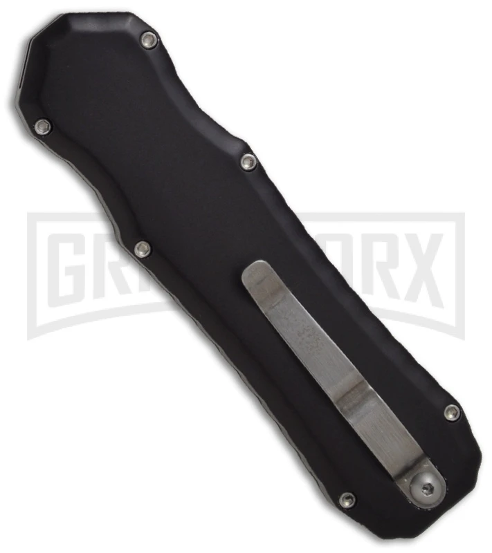 The Piranha Excalibur is a double action out-the-front automatic knife. The action on the Excalibur is solid and reliable. The handle is anodized 6061-T6 aluminum with a sliding firing button on front and a titanium tip-down carry pocket clip on back. The double-edge blade is 154-CM stainless steel.