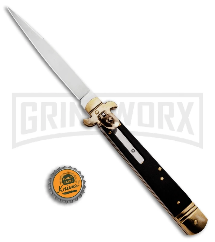 The perfect synthesis of a stiletto and a leverlock is here: the Slimline. Made by SKM, the Slimline features excellent workmanship and reliable action. The flat grind, stainless steel blade features a satin finish and a swedge. The black wood handle is built with gold-colored bolsters, stainless steel liners and brass pins. When you press the lever release, the action is fast and the lock-up is solid. These knives make beautiful collector pieces and are sure to be a treasured part of any collection.