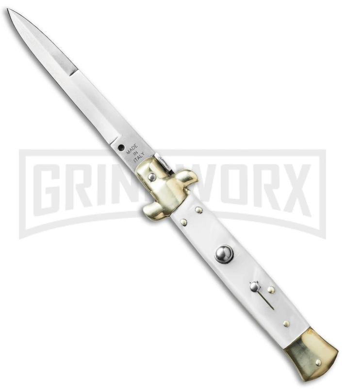 SKM 9″ White Pearlex Brass Bolster Automatic Stiletto Knife – Satin Bayo