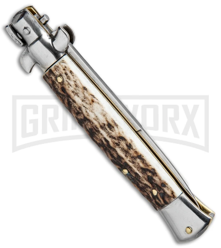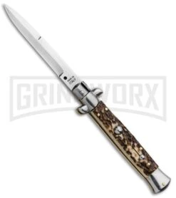 SKM AB 9″ Italian Stiletto Stag Automatic Knife – Bayo Satin Plain