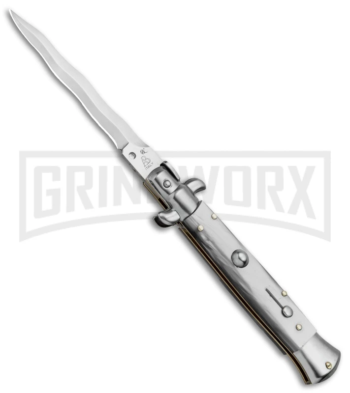 The SKM/AB Fantasy stiletto features eye-catching white pearlex handles. This model is equipped with a stainless steel kris style blade in a polished satin finish. The sliding safety, firing button and bolsters are made from polished nickel silver, which adds an elegant and collectible appearance to the piece. SKM/AB Stilettos are genuine Italian-made products that have “AB Italy” stamped on the tang of each blade. Add an authentic Italian stiletto to your knife collection today!