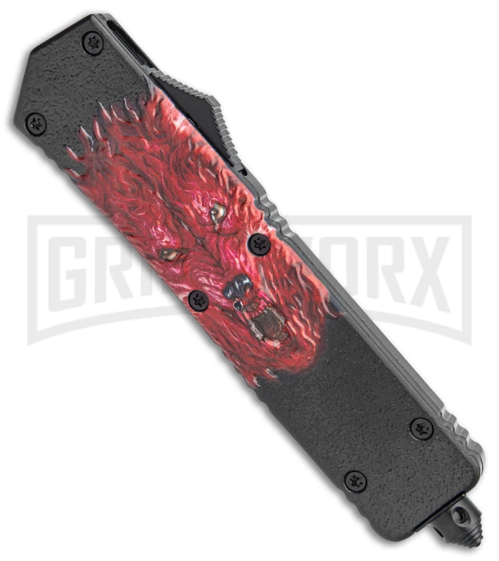 The Switchblade Systems Red Wolf is a budget double-action OTF knife with performance you’re sure to enjoy. It fires open and closes with the slide of the firing button. It has a red wolf molded body and includes a glass breaker tip and pocket clip. Its stainless steel dagger blade has a two-tone black and satin finish and two sharpened edges.