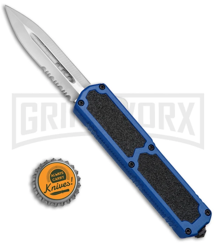 The Titan OTF knife represents a great balance of functionality, usability and value. It has a blue coated handle with grip inserts, ensuring slip-resistance. The partially serrated double-edge dagger blade is stainless steel with a satin finish. It has a side mounted firing button that makes the Titan slim and unobtrusive. The pocket clip is mounted on the back and fastened with a glass breaker tip.