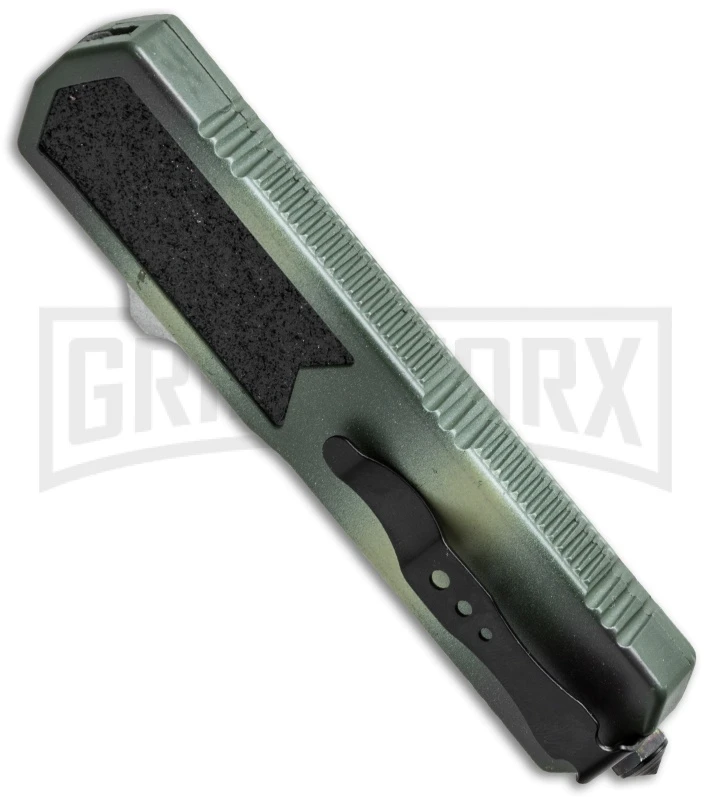 The Titan OTF knife represents a great balance of functionality, usability and value. It has a green camo coated handle with grip inserts, ensuring slip-resistance. The double-edge dagger blade is stainless steel and has a satin finish. The firing button is mounted on the side, making the Titan slim and unobtrusive. The pocket clip is mounted on the back and fastened with a glass breaker tip.