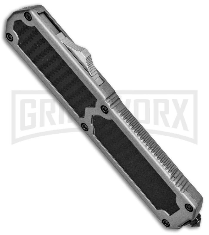 This Titan model has a gray finished handle with simulated carbon fiber inlays and a dagger blade with a satin finish.