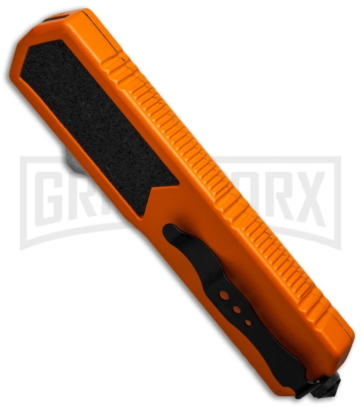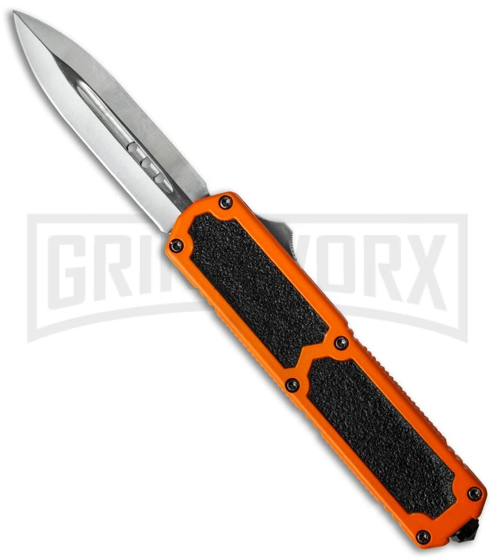 The Titan OTF knife represents a great balance of functionality, usability and value. It has an orange coated handle with grip inserts, ensuring slip-resistance. The double-edge dagger blade is stainless steel and has a satin finish. The firing button is mounted on the side, making the Titan slim and unobtrusive. The right hand/left hand reversible pocket clip is mounted on the back and fastened with a glass breaker tip.