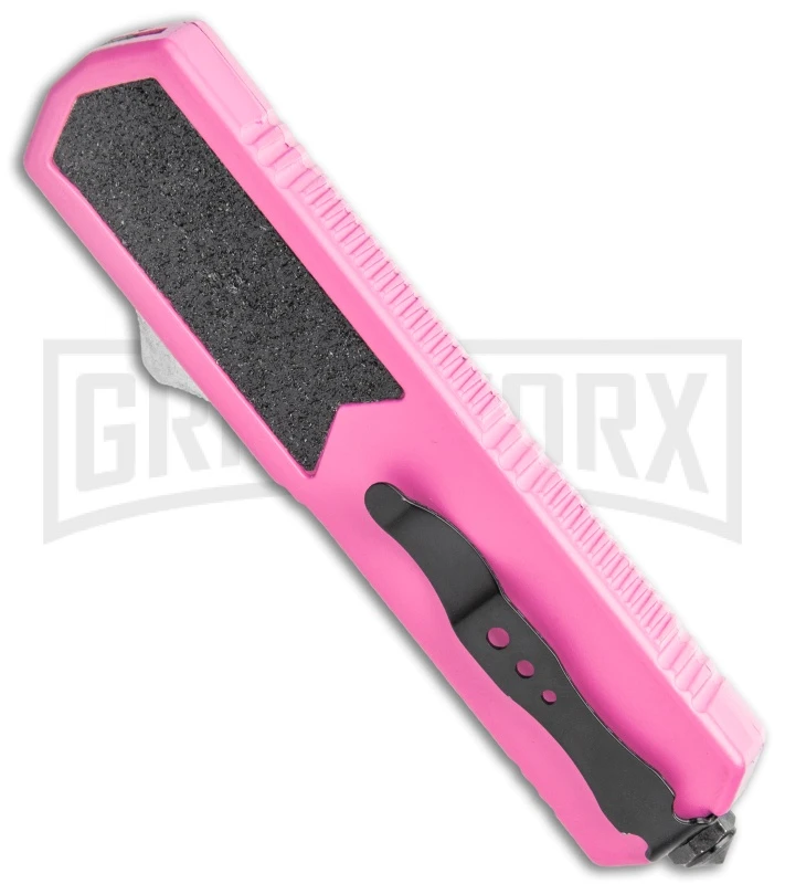 The Titan OTF knife represents a great balance of functionality, usability and value. It has a pink coated handle with grip inserts, ensuring slip-resistance. The tanto blade is stainless steel with a black finish. It has a side mounted firing button that makes the Titan slim and unobtrusive. The pocket clip is mounted on the back and fastened with a glass breaker tip.