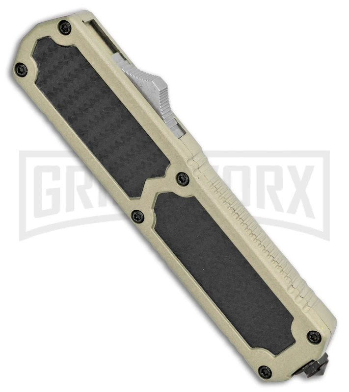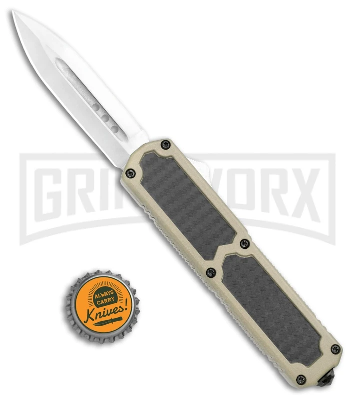 This Titan model has a tan finished handle with simulated carbon fiber inlays and a dagger blade with a satin finish.