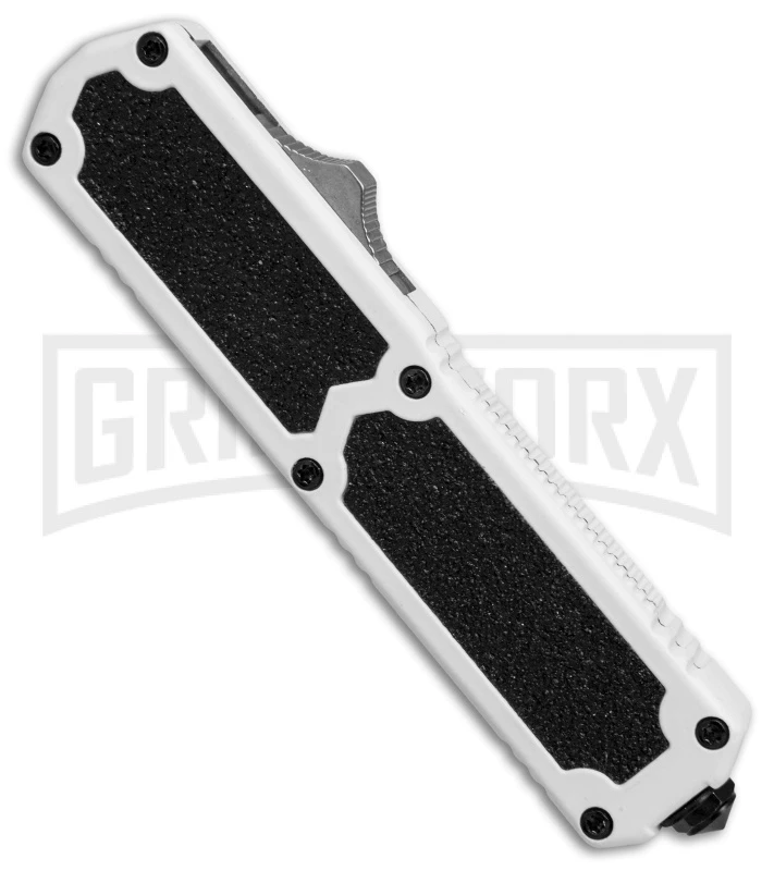 The Titan OTF knife represents a great balance of functionality, usability and value. It has a white coated handle with black grip inserts, ensuring slip-resistance. The partially serrated tanto style blade is stainless steel with a black finish. The firing button is mounted on the side, making the Titan slim and unobtrusive. The pocket clip is mounted on the back and fastened with a glass breaker tip.